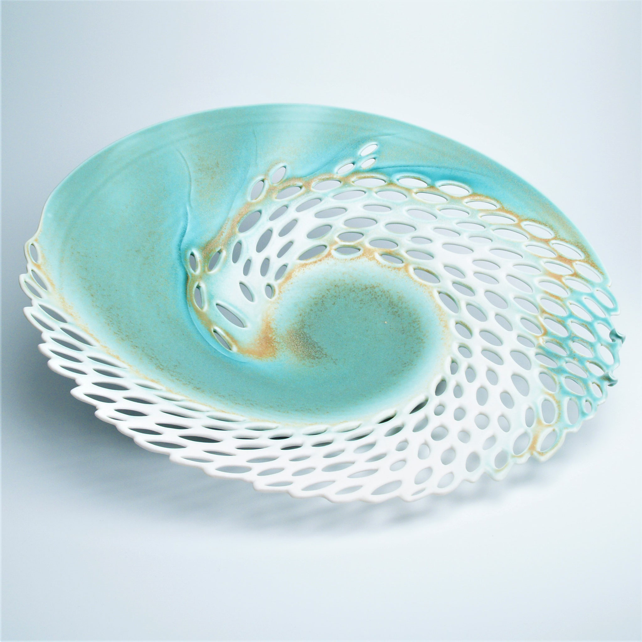 there. The piercings themselves play with the piece to induce the idea of movement and growth. Her use of blue, green and white glazes on a porcelain body also draw feelings of the underwater
